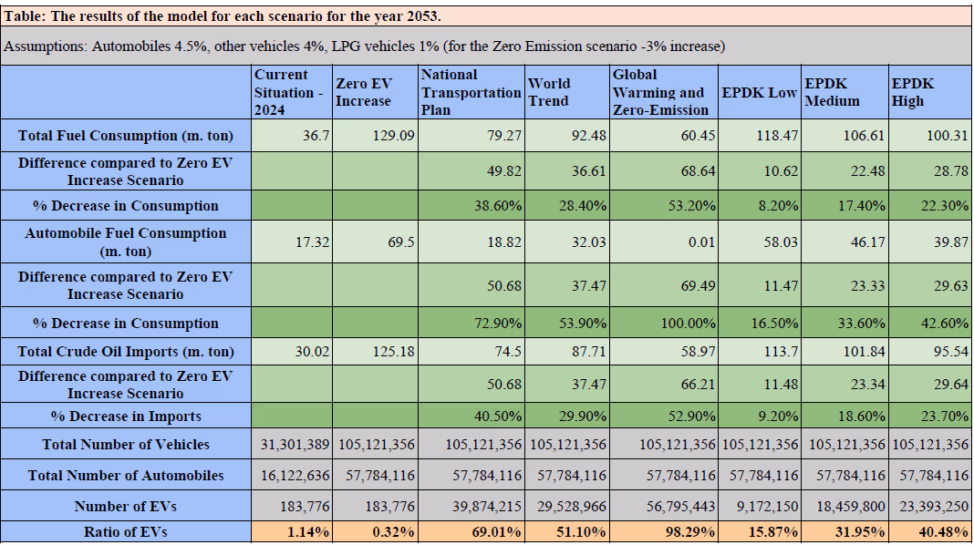 The table below compares projected EV numbers and penetration rates for 2053, as estimated by both the Ministry of Transport and EPDK: