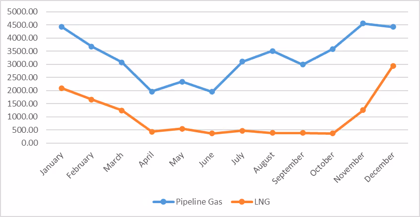 Figure 5 - Monthly LNG Vs. Pipeline Gas Imports of Turkey (2024, EPDK Data, MMscm)